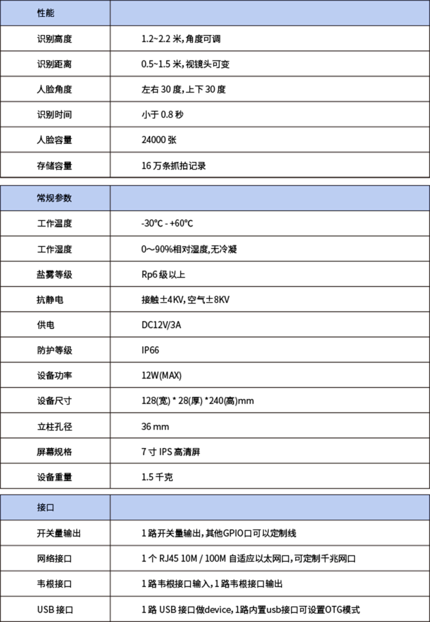 顺利获得多种质量测试,平均无故障运行时间达MTBF>50000 H,具备户外IP66级防水、防尘,并可在-30℃- 和+60℃的温度下正常工作。安装简单,适用于楼宇、学校、工地、写字楼等场景,可胜任人员道闸、智慧门岗、人证验证等多种工作岗位,安全、稳定、耐用。